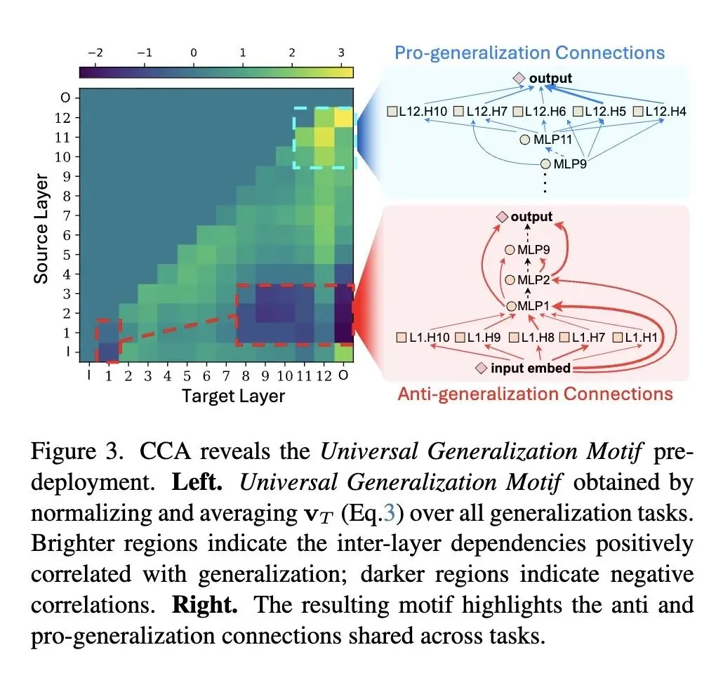 评估视角的根本转变:从“基于外部行为(输出/特征)”的评估转向“基于内部结构(因果回路)”的评估。将机制可解释性(MI)方法真正转化为具有强大预测能力的量化工程指标。 连续型回路表示:放弃了传统MI中为了人类可读性而使用的“二值化子图”,提出了连续的边权重映射(Edge Weight Mapping),保留了细粒度信息以支撑连续的性能预测。 发现“泛化模体(Generalization Motif)”:通过典型相关分析(CCA),在视觉Transformer(ViT)中首次提取出跨任务通用的网络布线模式,从结构上证明了“浅层捷径不利于泛化,深层依赖促进泛化”。 无标签阈值校准技术:为了在部署后触发准确的性能下降警报,创新性地利用替代性损坏数据集(Surrogate Data)进行阈值校准,打通了从理论到实际监控系统的闭环。
