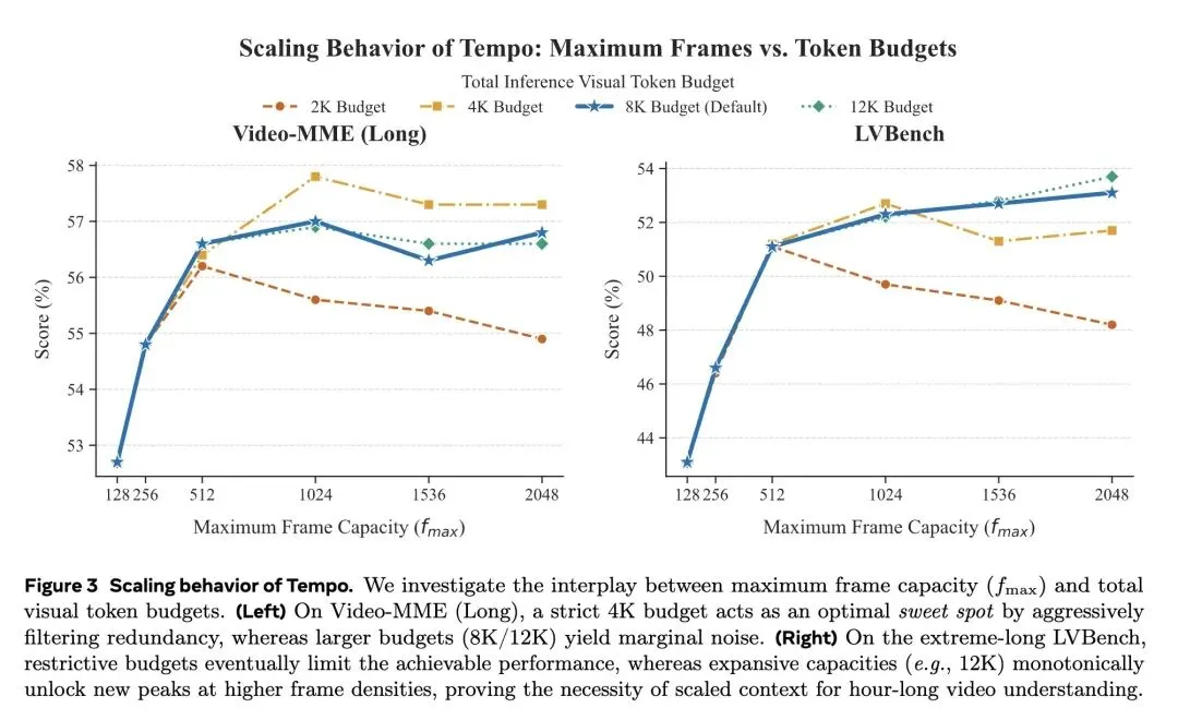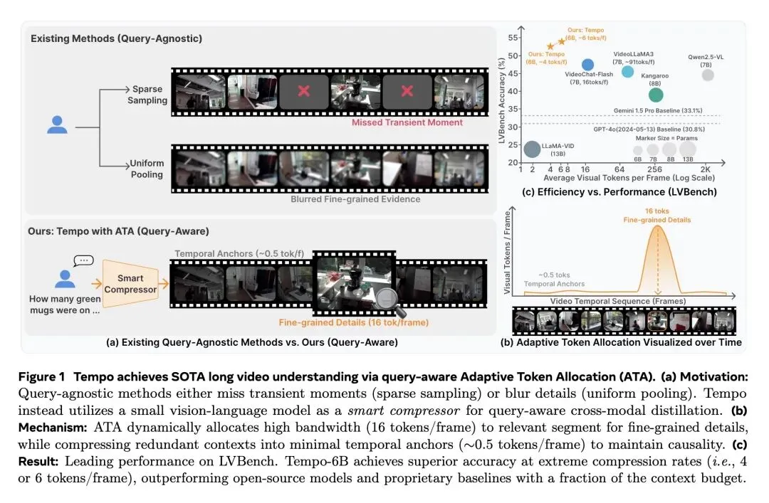 挑战了目前解决长视频理解的主流范式——即盲目扩展LLM的上下文窗口,或使用与用户查询无关的视觉启发式方法(如均匀稀疏采样或空间池化)。 提出了 Tempo,一个仅6B参数的框架,它将小型视觉-语言模型(SVLM)作为“局部时间压缩器”,在单次前向传播中执行感知查询(Query-aware)的跨模态蒸馏。 反直觉观点 1(语义前置现象 Semantic Front-Loading): 在因果注意力的作用下,SVLM会自然地将最关键、与查询最相关的视觉证据“打包”到最早生成的几个记忆Token中。因此,极其简单的 “头部截断(保留前k个Token)”操作,不仅零计算开销,且效果远超复杂的Token合并(ToMe)或尾部截断。 反直觉观点 2(零样本相关性先验 Zero-Shot Relevance Prior): 一个标准的预训练SVLM天生具备判断“查询-视频”相关性的强大能力。通过在生成记忆Token前探测“Yes”和“No”的对数概率差(Logit difference),Tempo在零延迟、无额外路由网络的情况下获得了高精度的动态路由信号。 引入了 自适应Token分配(ATA),为查询关键片段动态分配高带宽(最高16 Tokens/帧),同时将冗余背景片段极致压缩为微小的“时间锚点”(例如0.5 Token/帧),以极低成本维持全局因果故事线。 高信息熵结果(少即是多): 在标准长视频任务中,严格的4K Token预算往往跑赢宽裕的8K预算。严格的信息瓶颈过滤了背景噪声,迫使LLM专注核心语义节奏,主动缓解了“中间迷失(lost-in-the-middle)”导致的注意力稀释问题。 高信息熵结果(按需分配而非贪婪填充): 即使给定8K或12K的上限,Tempo在实际处理小时级视频时,消耗的Token数也往往远低于理论上限(实际仅约3 Tokens/帧)。这证明真正的长视频理解依赖于“语义必需性驱动”的压缩,而不是贪婪地塞满上下文窗口。 在极端长视频基准LVBench(4101秒)上,紧凑的6B架构取得了SOTA(8K预算下得分52.3),以压倒性优势击败了依赖海量上下文窗口的闭源巨头 GPT-4o(30.8)和 Gemini 1.5 Pro(33.1)。