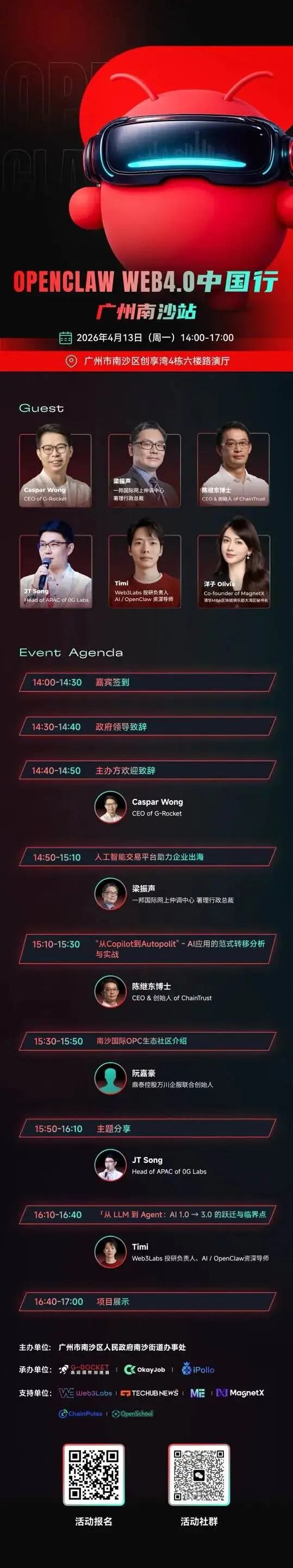 2026 年 4 月 13 日(周一)14:00-17:00,广州市南沙区创享湾 4 栋六楼路演厅,我们集结 AI、Web3、企业出海、区块链等领域的顶尖大咖,拆解行业趋势,分享实战干货,链接全球资源,共探 WEB4.0 时代的无限可能!