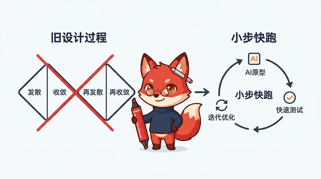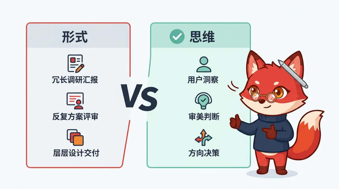 但实际上被否定的不是思维,是形式。Jenny Wen演讲的核心其实很清晰,她不是说「以用户为中心」这个根基错了,她说的是围绕这个根基搭建的那套流程太慢了。你依然要洞察用户需求,依然要理解业务场景,依然要在多个方案中做判断和取舍。这些能力一点都没贬值。贬值的是你用来展现这些能力的「仪式」,那些冗长的调研汇报、反复的方案评审、层层的设计交付物。