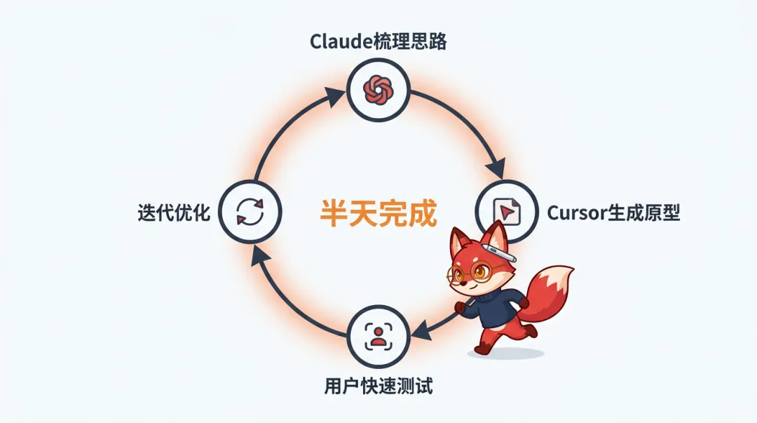 这两个概念的核心思路是一样的,把原来线性的、漫长的流程拆解成一个个小阶段,每个阶段都用AI快速迭代,小步快跑。你不需要花三天写一份完美的设计方案文档,而是先用Claude快速梳理思路,再用Cursor或者v0快速生成可交互的原型,直接拿去做测试。整个过程可能就半天。