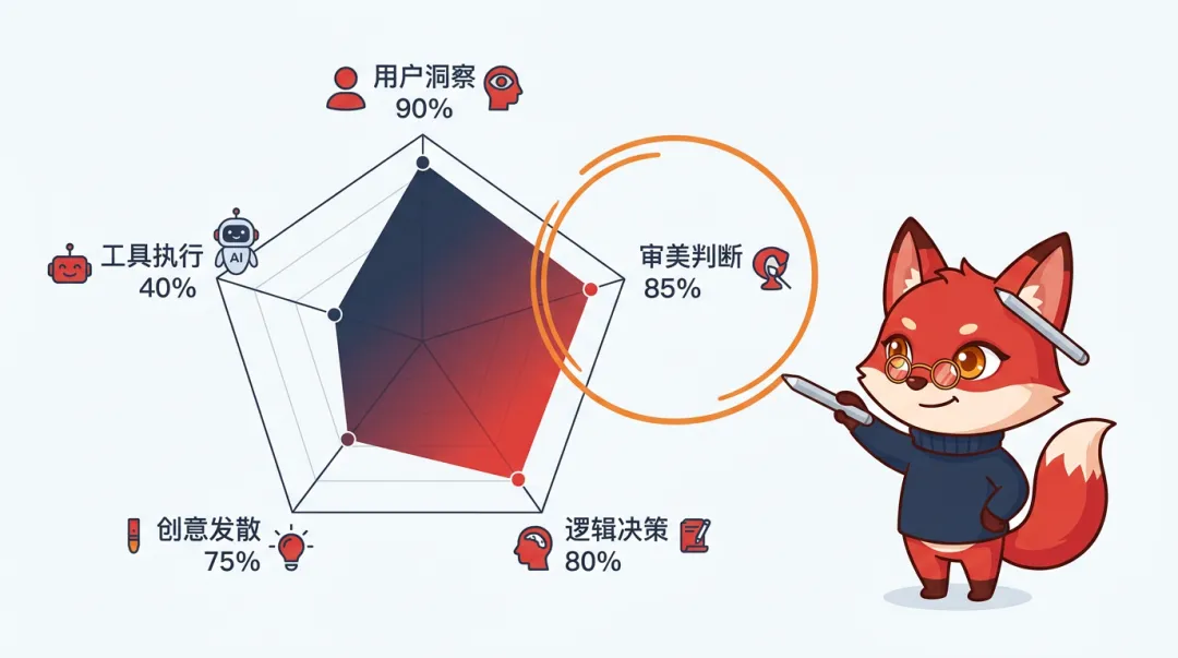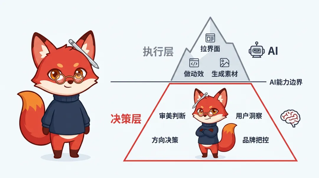 你想想看,当AI可以在几分钟内生成十几个设计方案的时候,谁来判断哪个方案更好?谁来决定方向是否正确?谁来把控体验的一致性和品牌的调性?