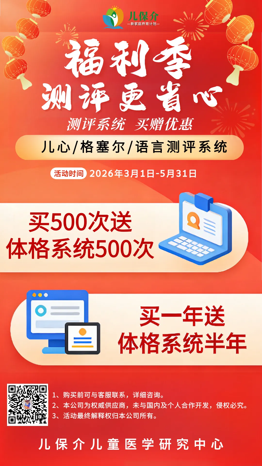 儿保测评软件系统买一送一进行中~赠送时间:2026.3.1-5.31以打款为准,5月31日前付款有效体格发育系统单独购买8元/次,500次4000元,6个月5000元。1、儿心量表II系统7500元500次,赠送体格发育系统500次;2、Gesell系统7500元500次,赠送体格发育系统500次;3、语言SS系统7500元500次,赠送体格发育系统500次;4、儿心量表II系统10000元1年不限次,赠送体格发育系统6个月不限次;5、Gesell系统10000元1年不限次,赠送体格发育系统6个月不限次;6、语言SS系统10000元1年不限次,赠送体格发育系统6个月不限次;赠送时间:2026.3.1-5.31有需要请扫码联系工作人员添加好友请备注"姓名+单位名称”特惠时间:2026.3.1-5.31