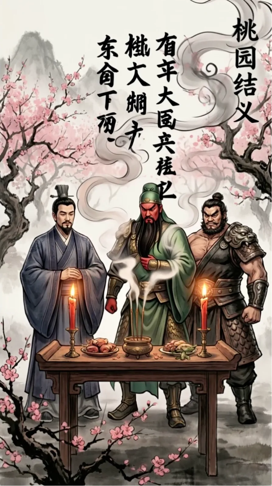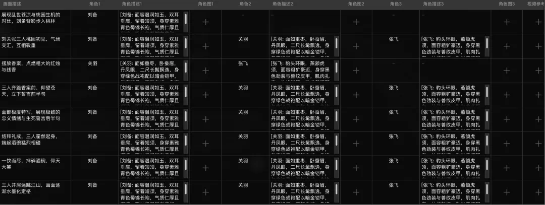 角色档案:为刘备、关羽、张飞分别生成三视图(正面/侧面),锁定形象特征