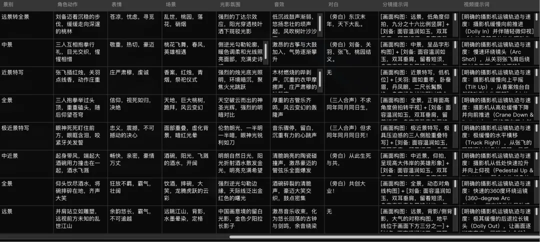 规范化描述:每个分镜包含角色状态、场面调度、对白文本、运镜方式(如"特写→拉远")