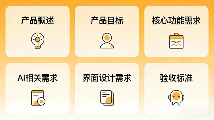 模块1:产品概述。简单介绍产品的定位、目标用户、核心价值,比如“本产品是一款AI文案助手,目标用户是18-35岁的自媒体博主、职场白领,核心价值是帮助用户快速生成高质量文案,节省时间成本”。