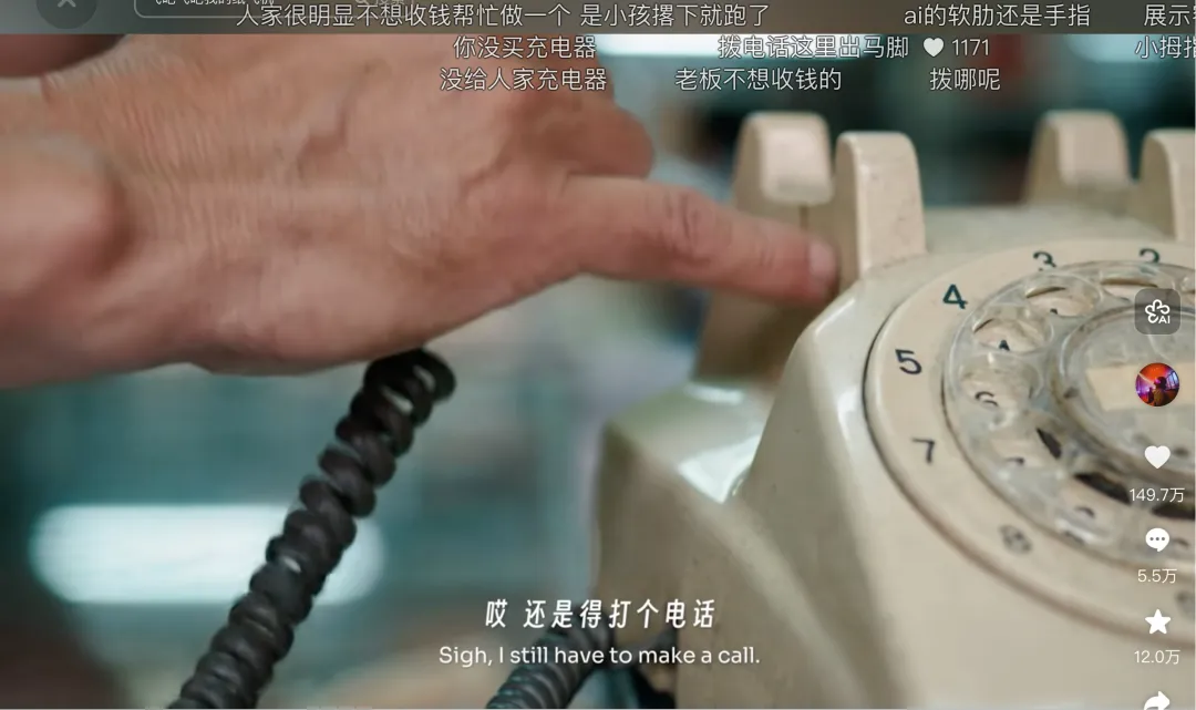 在这部短片中,有一处被观众频繁讨论的“破绽”:在一个打电话的镜头中,纸扎店老板并没有拨动电话。也正是这个穿帮的细节,让这部短片拥有了自己的“AI身份证”。
