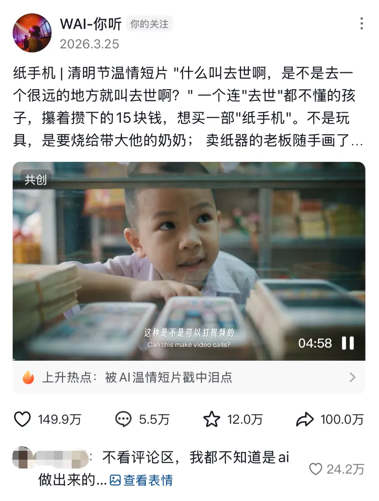 这是抖音上一部AI短片《纸手机》中的一幕。清明节前夕,这部五分钟的短片在全网迅速传播,截至目前播放量已超4000万,被央视新闻、人民日报等主流媒体纷纷转发。
