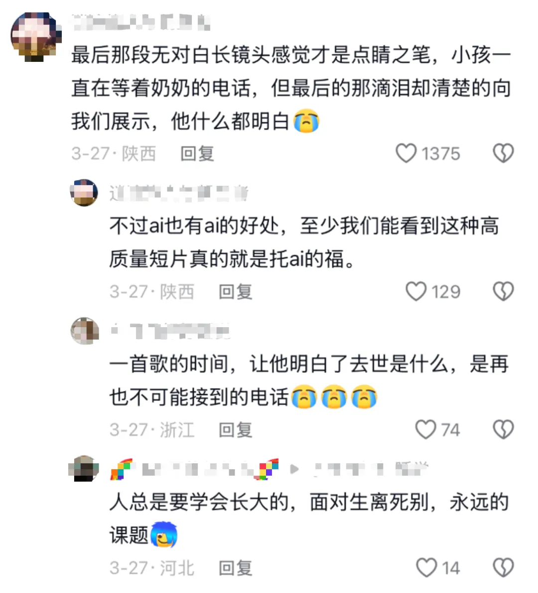 在抖音的评论区里,有人说:“明知道是AI,但还是看哭了。”也有人称自己“被AI骗走了一车眼泪。”更多的人,开始讲述自己的经历,他们提到去世的亲人和那些来不及说出口的告别。