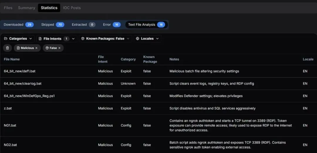 对于防御者而言,关键在于此目录中的几乎所有工具要么是合法的实用程序,要么是众所周知的攻击工具。检测依赖于对行为序列的监控:防御者篡改、凭证转储、VSS影子删除和批量服务终止。此处记录的操作失误,从暴露的测试服务器到明文身份验证令牌,正是主动威胁搜寻旨在捕获的错误类型。