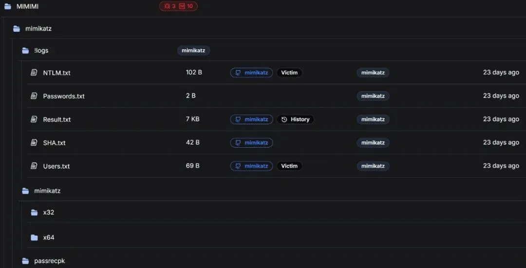 MIMIMI目录包含Mimikatz二进制基础架构(x32、x64和passrecpk子目录),以及一个结构化的!logs子文件夹,其中包含先前凭据收集操作的输出文件: