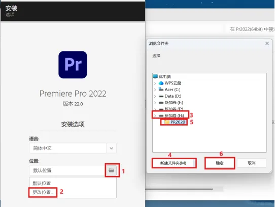 3.点击文件夹图标点击更改位置选择要装的盘符位置点击新建文件夹,并重命名PR2022,点击确定