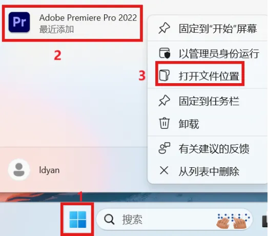 7.点击桌面下方开始菜单,选中 Adobe Premiere Pro2022,点击鼠标右键,选择更多,点击打开文件位置。