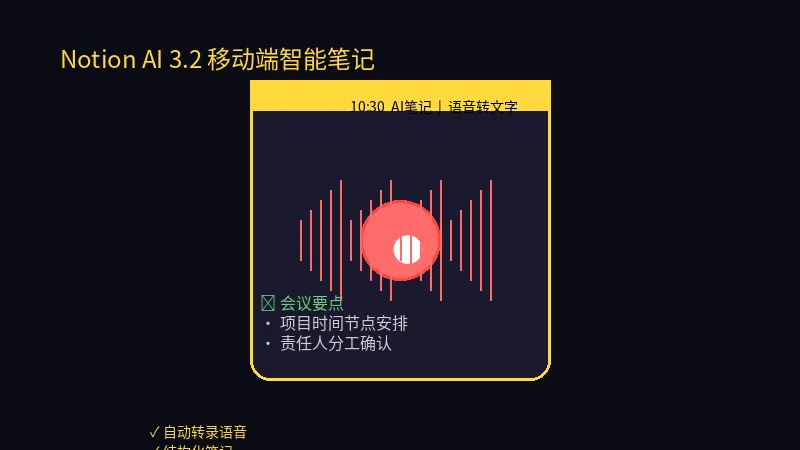 前几天刷到个新闻,Notion AI发布了3.2版本,最牛的是移动端AI笔记功能。比如你通勤时突然有个想法,对着手机说几句话,AI自动就能把语音转成结构化的笔记、行动项,还能分门别类。