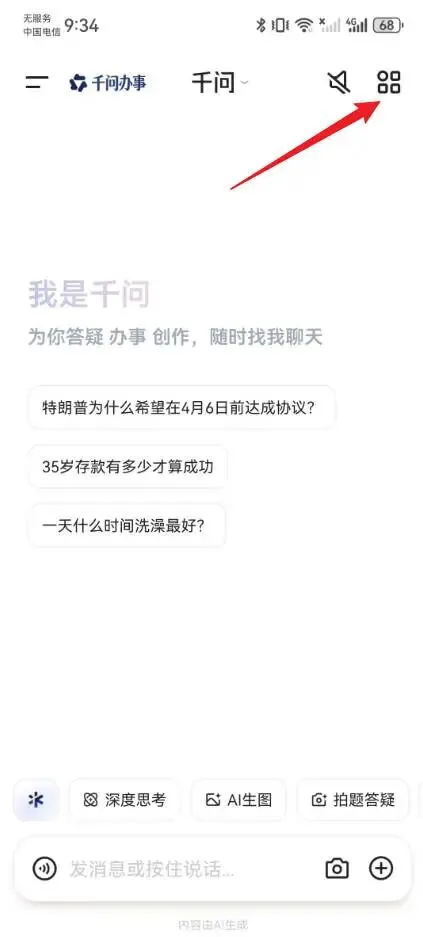 1、在手机上打开千问APP,进入到首页后,点击“四点”图标。