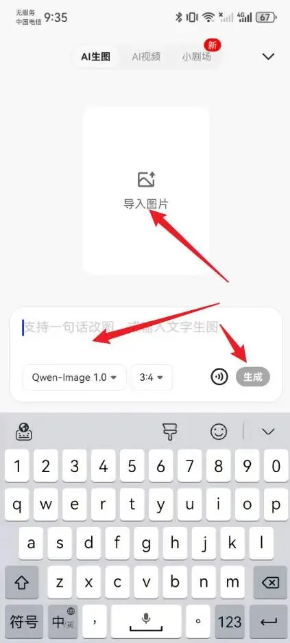 3、进入到AI生图页面,导入图片、输入文字描述、使用模型,点击“生成”。