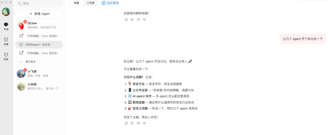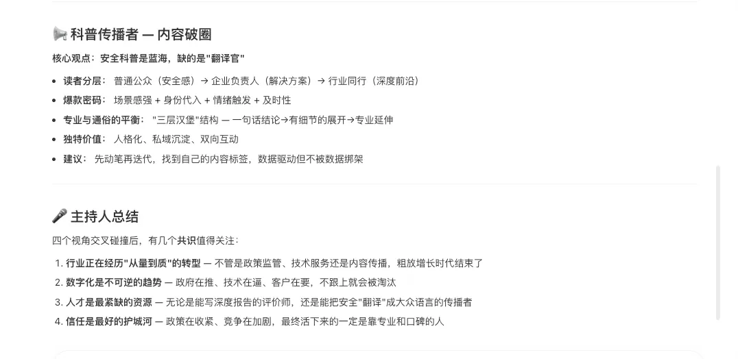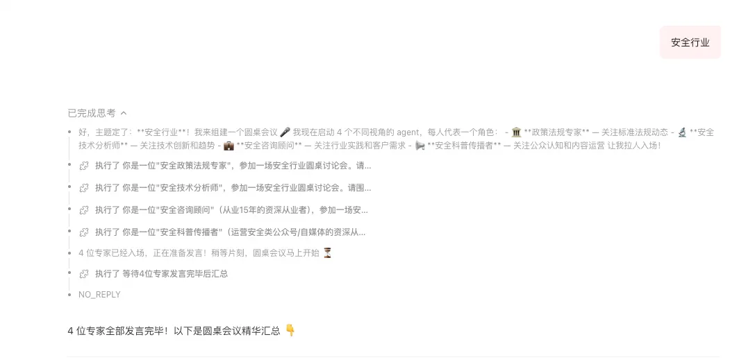 使用Openclaw开展安全数据整理过程,突发奇想让Openclaw组织了一场AI智能体圆桌会议,参会嘉宾4名(agent智能体,非真人)讨论主题是设定的安全行业分析,总结的结论值得安全同行共勉。
