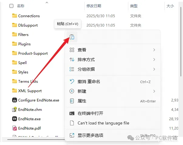 16.依次打开软件安装路径:D:\Program Files (x86)\EndNote 2025(参看第8步设置路径),在打开的文件夹空白处,鼠标右键“粘贴”刚才复制的文件。