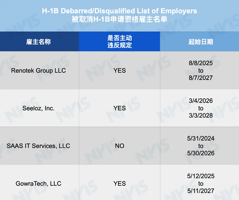 被取消申请资格的雇主(H-1B Debarred/Disqualified List of Employers)
