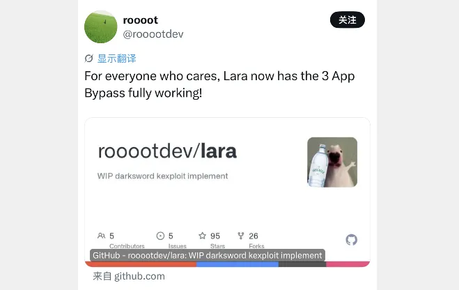 在4月10日上午时段,roooot 开发者在 X 推特上针对 lara 工具推出 1.2 版本,此版本添加突破3个App安装限制,也就是说自签安装可以突破3个应用安装了。