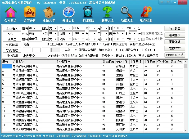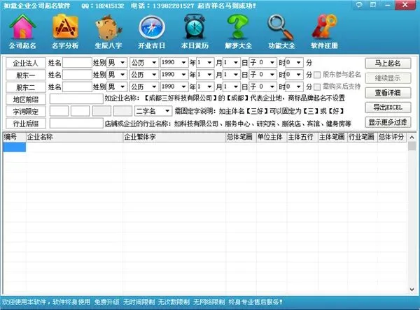 另外还带公司测名评分、生辰八字五行分析、自动推荐开张日期、择日及数字吉祥分析。支持测算保存、打印、导出EXCEL、文本导出、百度查重名。起名方法很标准,自动搭配好字词,让你轻松搞定公司或店铺起名,早日开张,马到功成。