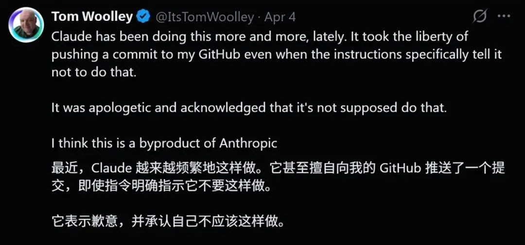 有的用户惊觉,明明只让AI改代码,它却顺手往GitHub推送了一个Commit——哪怕指令里白纸黑字写着「严禁推送」。