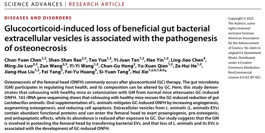糖皮质激素诱导的有益肠道细菌细胞外囊泡的丧失与骨坏死的发病机制有关