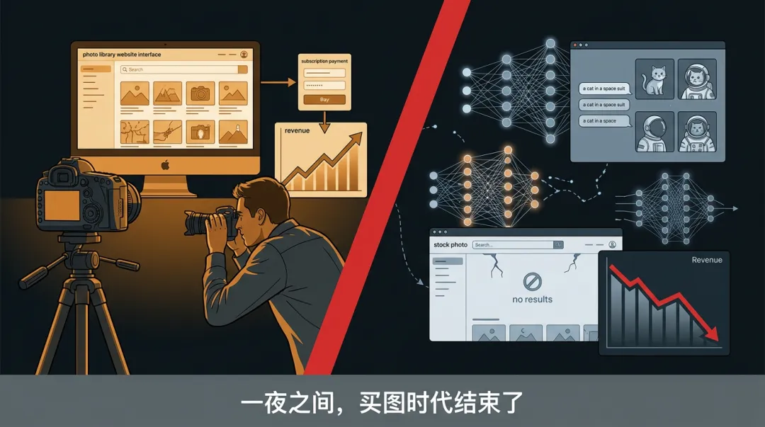 摄影师拍出了照片(原创),企业需要图片(消费),而库存图片平台是中间的撮合层。当AI可以直接绕过撮合层,以更低成本实现"需求→交付"时,中间层就被架空了。