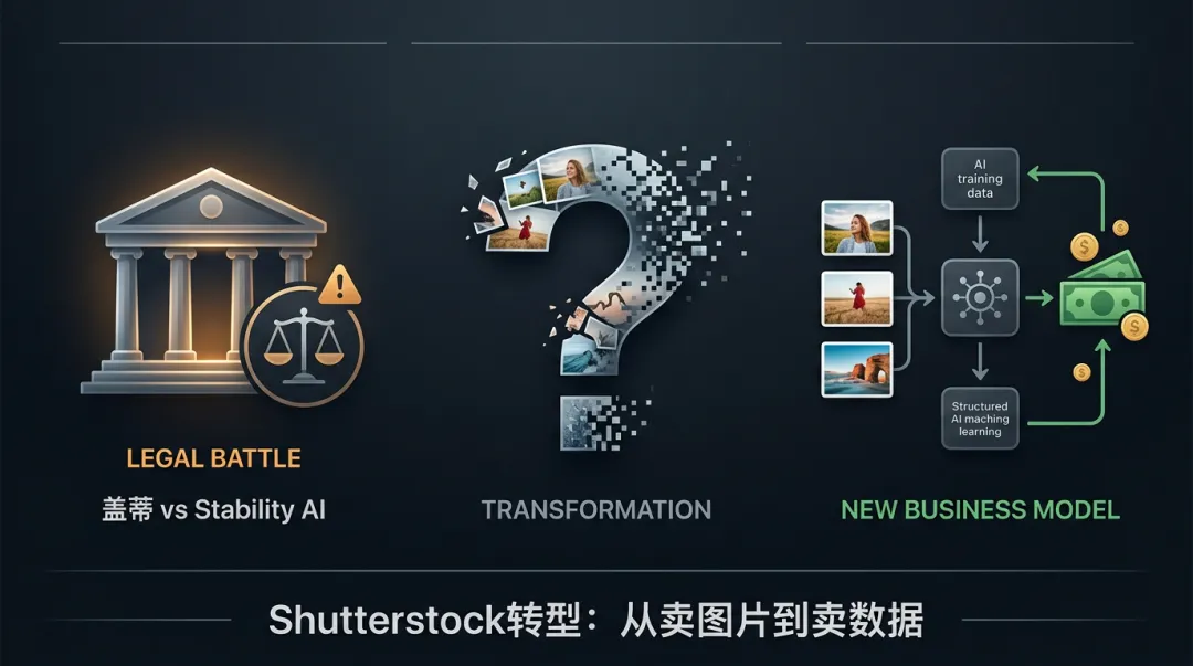 当我们还在讨论"AI会不会取代设计师"时,有一群人已经被悄悄消灭了——他们是库存图片的提供者和平台。Shutterstock、Getty Images等全球顶级图片版权巨头,正在经历一场史无前例的收入崩塌。不是缓慢衰退,而是断崖式下跌。