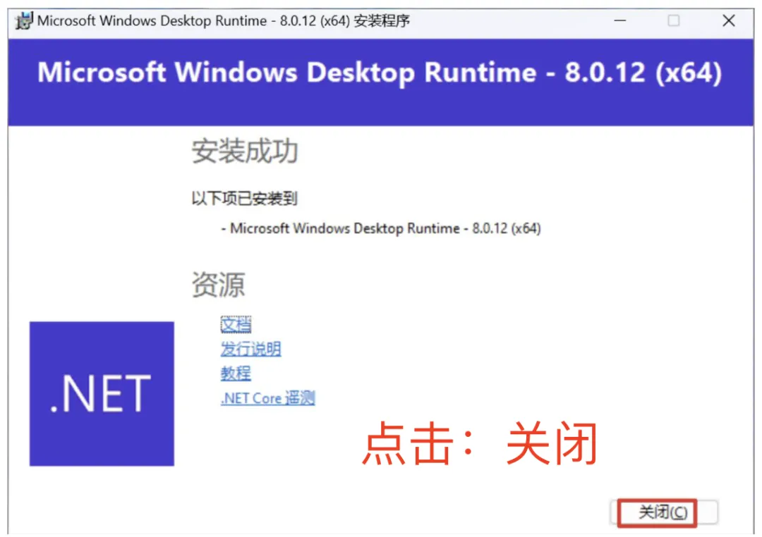点击:安装,等待安装完成后再点击:关闭。