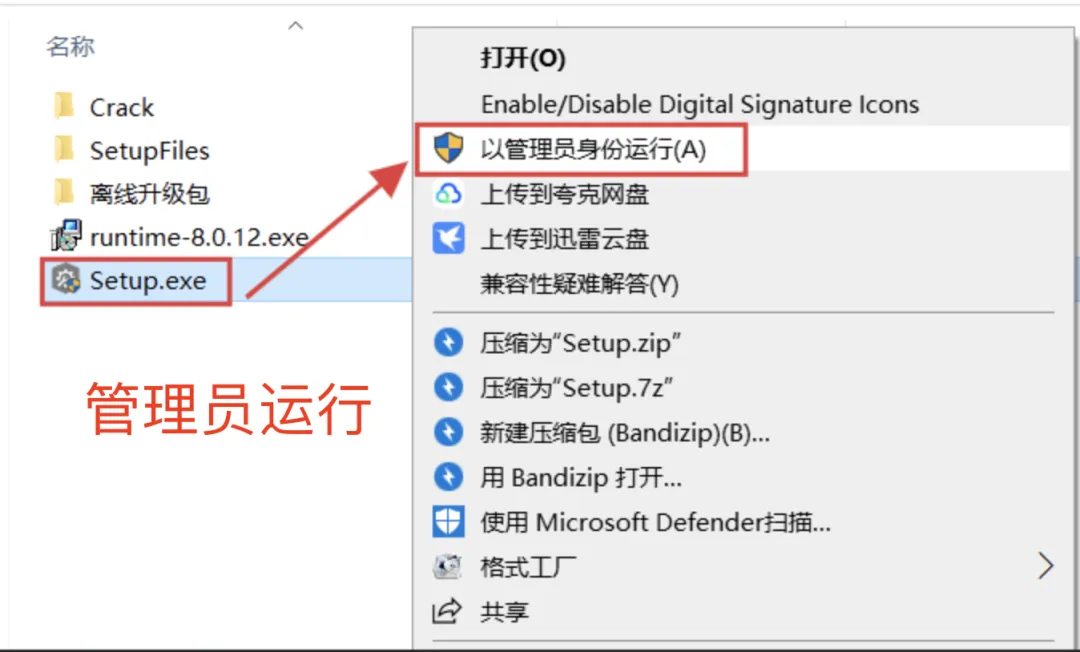 返回文件夹,右键点击:Setup 程序,选择:以管理员身份运行。