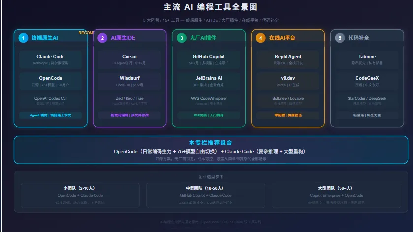 本专栏推荐的企业级组合是:OpenCode(日常编码主力) + Claude Code(复杂任务处理)。