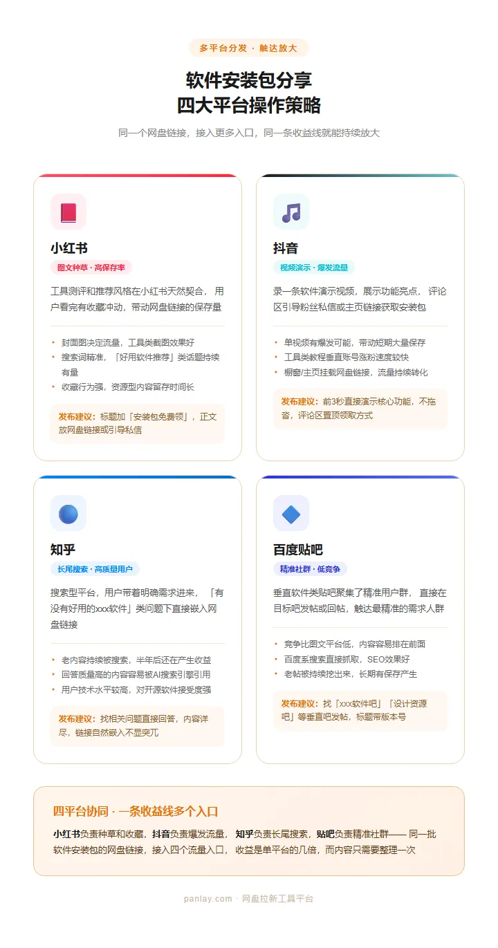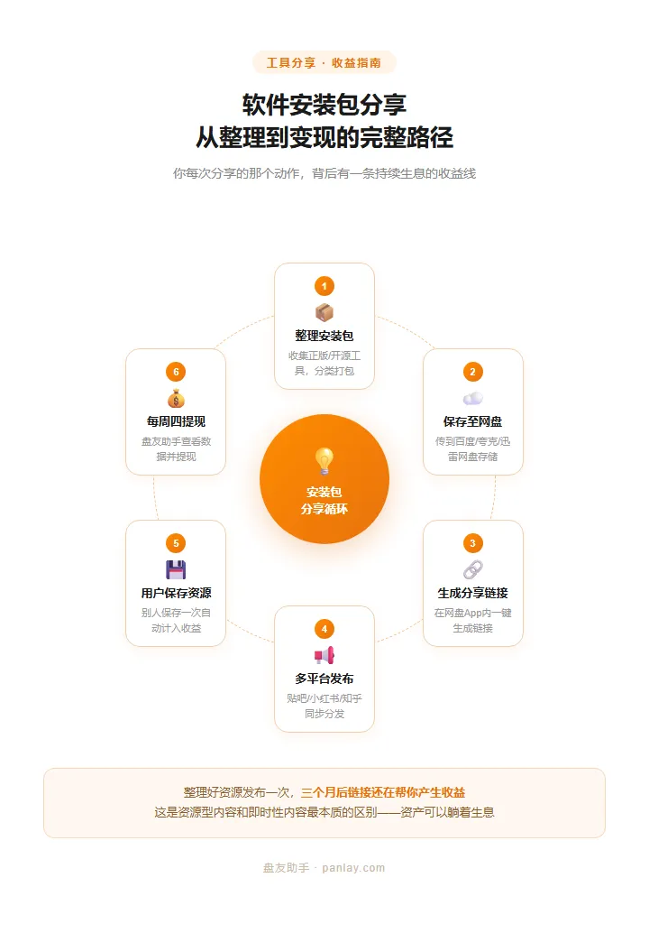 软件安装包博主,你每次分享的那个动作,背后有一条你没发现的收益线一、 分享安装包,你在做一件更大的事很多人做工具类内容,出发点很简单——觉得某个软件好用,想分享给更多人,于是花时间整理,打包,传到网盘,把链接发出去,有人下载,你开心,结束,这个逻辑本身没错,但它漏掉了一半你传到网盘的那个软件安装包,每一次被别人保存,都可能在悄悄帮你计一笔钱,而大多数做工具分享的人,完全不知道这件事二、 底层逻辑:网盘为什么愿意付钱要理解这件事,得先想清楚一个问题——网盘平台靠什么赚钱它赚的是会员费,但要让人买会员,首先得让人注册,让人用起来,所以网盘平台愿意拿出一部分会员收入,反哺给那些帮它带来新用户、带来活跃度的人,这就是它们设计推广机制的底层逻辑——你帮它做传播,它给你分钱具体来说,这套机制分两层,第一层,叫做带来新用户——一个原本没有这个网盘账号的人,通过你的链接注册了,平台给你一笔固定奖励,第二层,叫做带来活跃度——一个已有账号的老用户,把你分享的资源保存到他的网盘里,平台也给你一笔流量佣金,这两件事,你只要在用网盘分享软件安装包,每天都在触发,只是以前触发了你也不知道三、 软件安装包,为什么是这套机制里最好使的品类不是所有资源都一样,软件安装包有一个非常关键的特性——搜索需求持续存在课件、报告、考试资料,有明显的季节性,但软件安装包不一样,今天有人要找视频编辑工具,明天有人要找系统优化软件,后天有人要找格式转换程序,需求从来不断,这意味着你今天在网盘里整理好的一批软件安装包,三个月后还在帮你赚钱这是时间复利,也是内容类资产和即时性内容最本质的区别做安装包分享的人还有另一个优势——资源本身的信任感你分享的是正版或开源工具,不涉及灰色地带,对用户来说风险低,保存意愿高,这直接拉高了你的转存率,也就拉高了你实际到手的收益四、 一个你可能没想到的增幅方向很多做工具分享的博主只在一个平台发内容,比如只在公众号更新,或者只在B站出视频,但资源本身是平台无关的同一批软件安装包的链接,可以同时发到贴吧、知乎、小红书、闲鱼,每一个平台都是一个入口,而这些入口背后指向的都是同一个网盘链接,触达量乘上去了,收益自然也跟着乘,最核心的理解是——你不是在多平台运营,你是在给同一条收益线装更多漏斗口每增加一个平台,就多一批不同用户能找到你的资源,工具分享这个方向,天然适合这个打法五、 收益是什么量级直接说数字,百度网盘,带来一个新用户¥12,一次转存¥0.45;夸克网盘,新用户¥7,转存¥0.3;迅雷网盘,新用户¥6~15,转存¥0.5~1,这个数字看起来不大,但你要想的是,一个整理了几十个软件安装包的网盘,每天有多少次被不同的人保存,刚开始可能一天赚个饭钱,但资源铺开之后,某天后台一看,几百块悄悄进来了而且这钱不需要你每天盯着,你上个月发的那批资源,今天还在帮你产生流量佣金,这就是做资源内容和做即时服务最根本的差距——资产是可以躺着生息的网盘拉新这个机制,对工具分享类博主来说,就是把原来单纯做内容的行为,叠加了一层持续的收益结构六、 怎么开始流程不复杂,通过盘友助手注册——盘友助手是专门负责网盘账号绑定授权和佣金查看提现的工具,因为网盘APP本身不显示你的推广收益,只有通过这里才能看到数据,绑定之后,在网盘APP里正常分享你的软件安装包链接就行,有人保存,系统自动计入,每周四可以提现,T+2更新数据,不需要改变分享习惯,不需要额外购买任何东西,你本来就在做的那个动作,换个姿势就能多一条收益线感兴趣的话,可以从这里了解长按扫码 ▼注册后,公众号后台回复【教程】领取完整推广教程