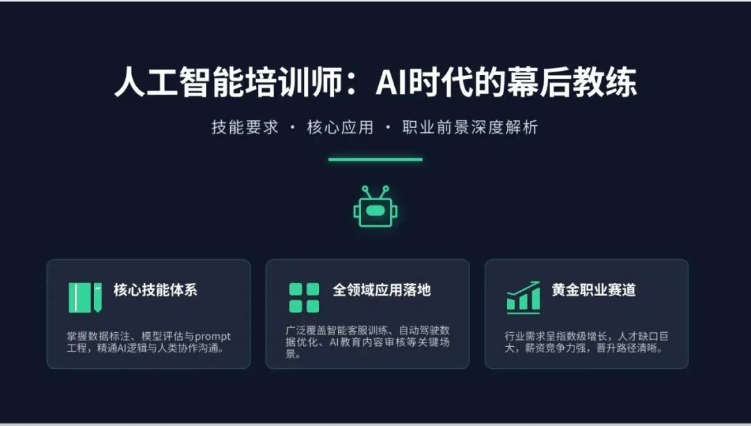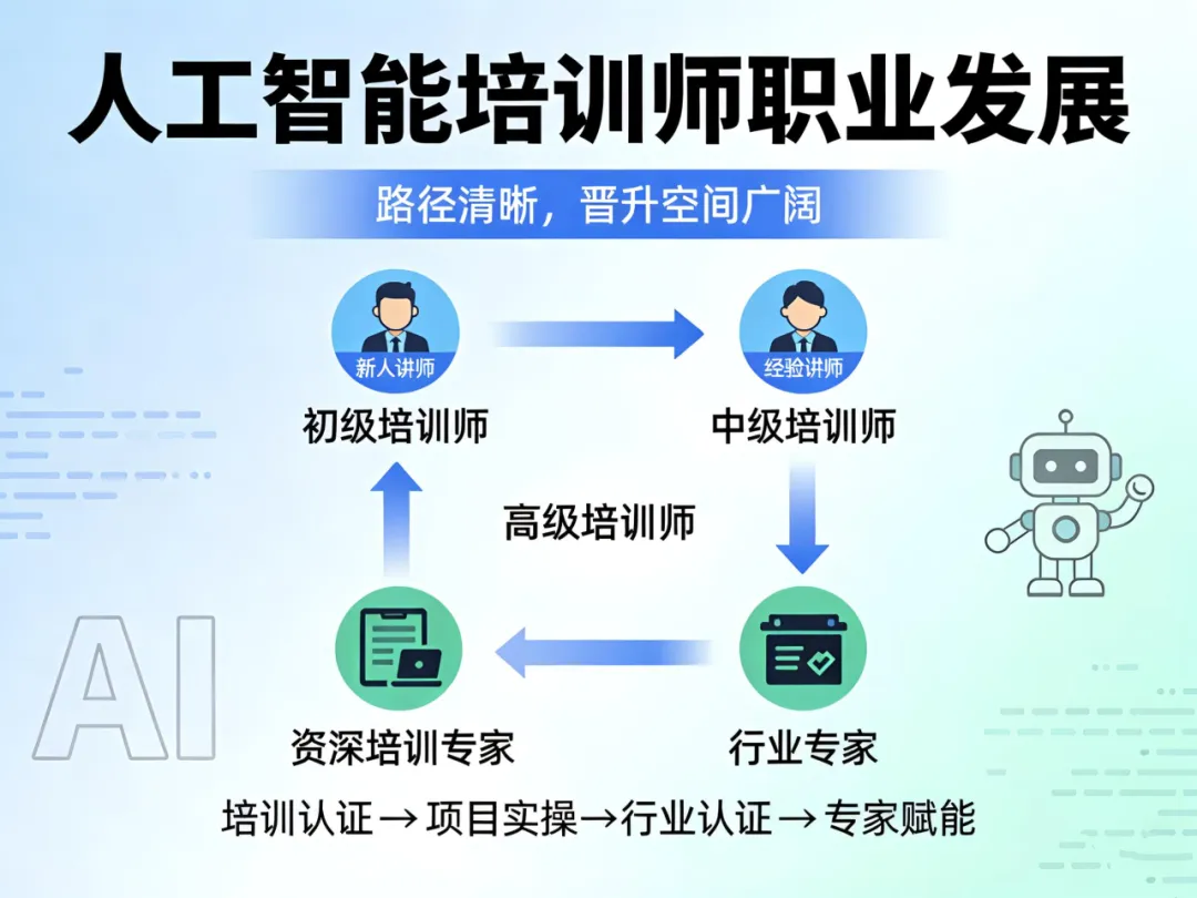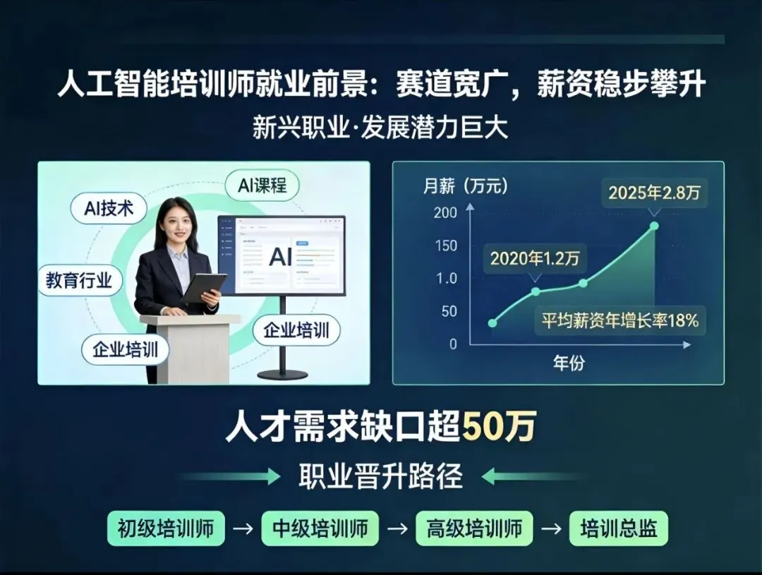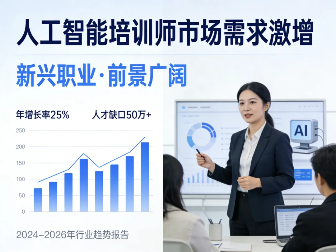 AI浪潮重塑职场,人工智能培训师站上风口。作为连接技术与产业的关键角色,这一职业正成为普通人跨界转型、抢占数字经济红利的优选赛道。本文从核心技能、政策导向、市场需求、就业前景、职业发展五大维度,全面解读这一朝阳职业。