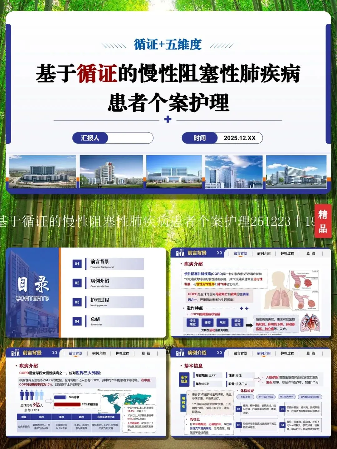 大家好!今天我想和大家分享基于循证的慢性阻塞性肺疾病患者个案护理实践。慢阻肺是全球第三大死亡原因,我国 40 岁以上人群患病率高达 13.6%,近亿患者深受其扰,急性加重期更是危及生命。作为护理人员,用循证理念指导临床,是提升救治质量、改善患者预后的关键。