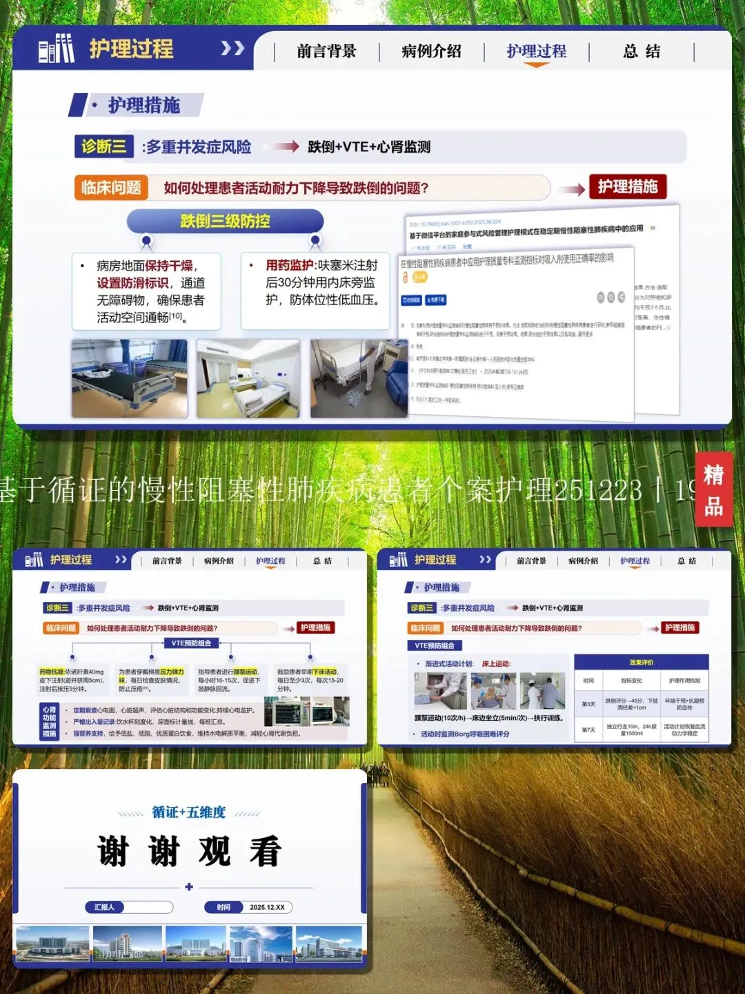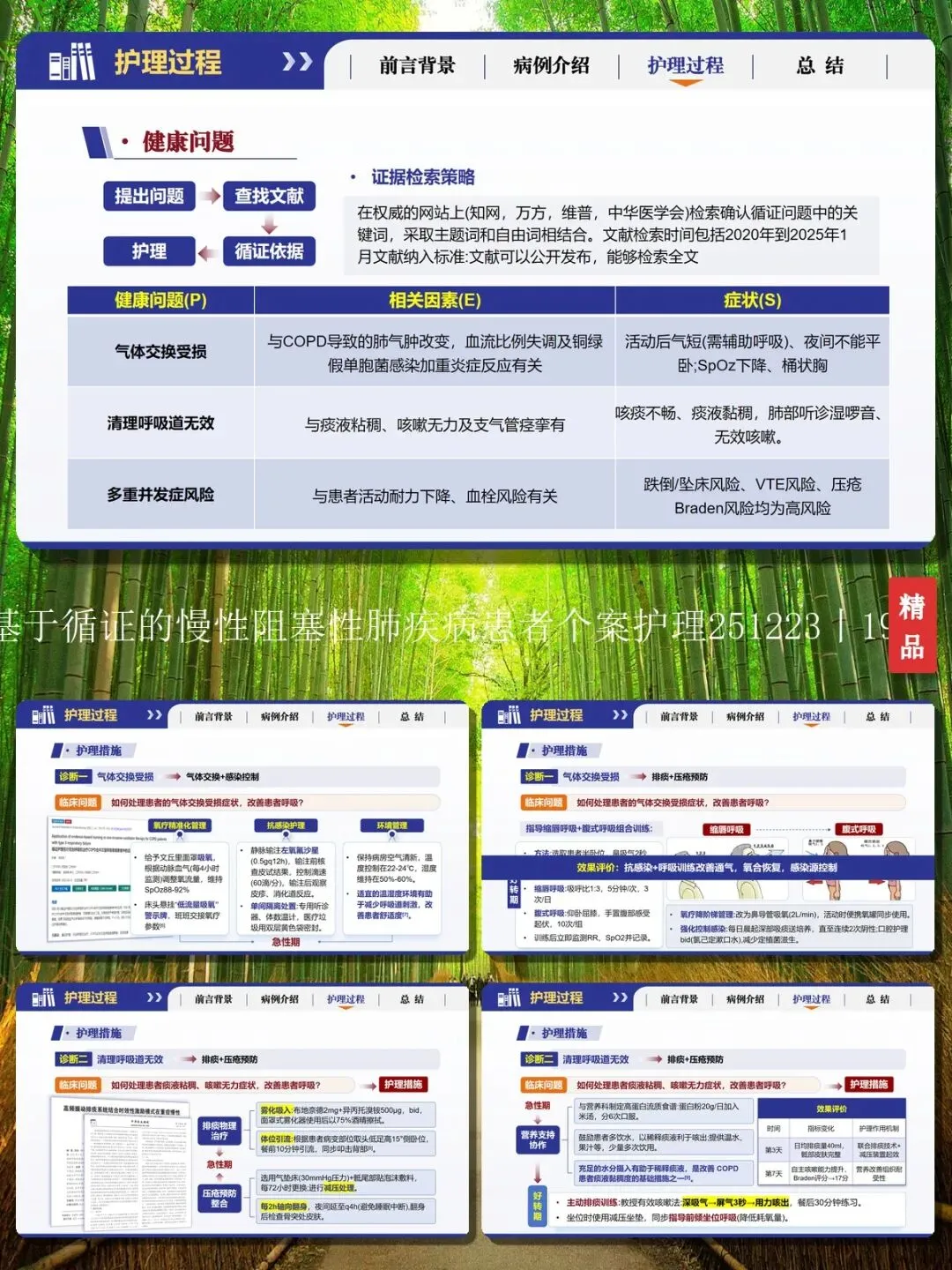 我们护理的是一位 69 岁慢阻肺急性加重合并肺心病、肺部感染的患者,入院时呼吸困难、口唇发绀,存在严重气体交换受损、痰液潴留,同时跌倒、血栓、压疮均为高风险。面对复杂病情,我们没有仅凭经验护理,而是以循证为依据,从五大维度全面评估,精准锁定核心问题。