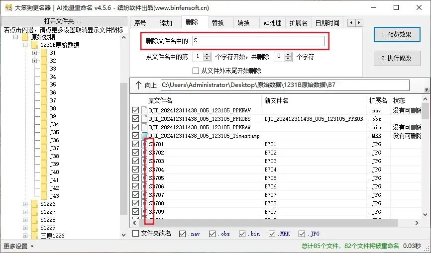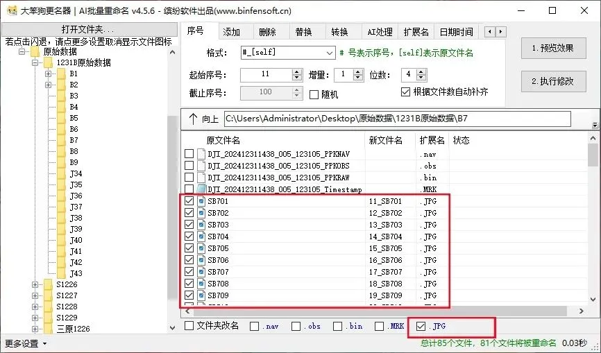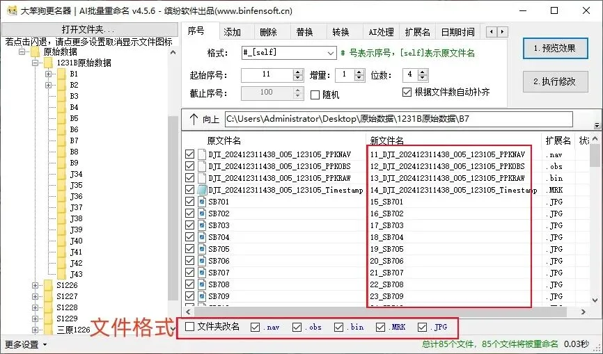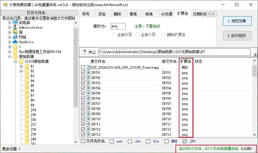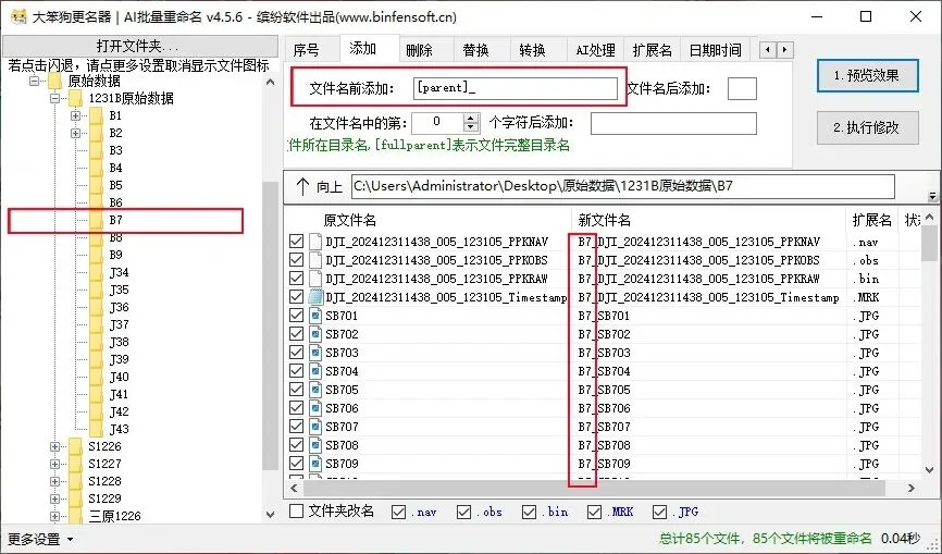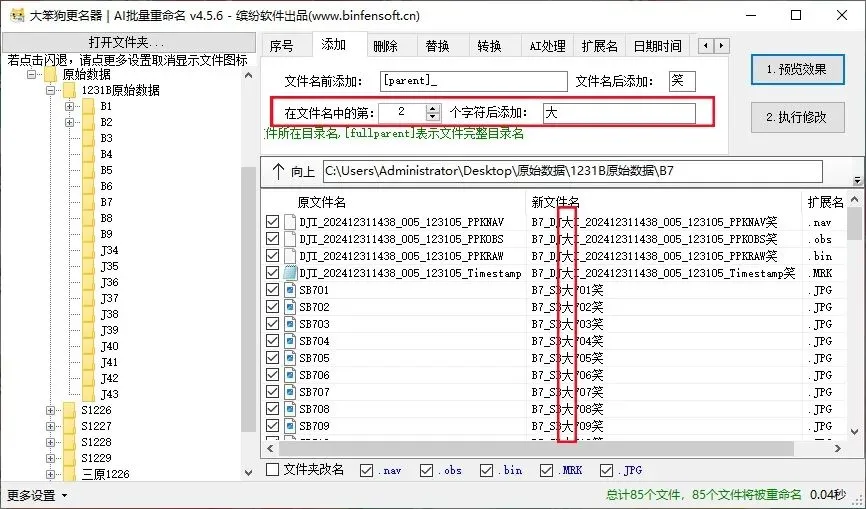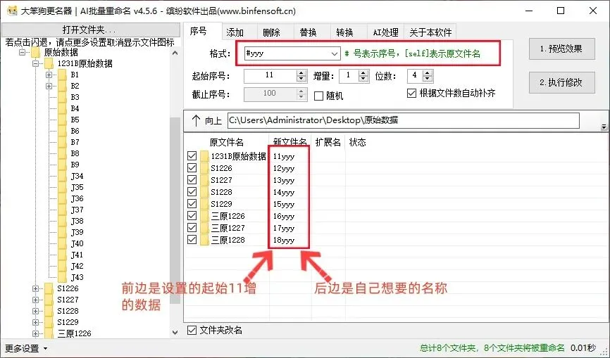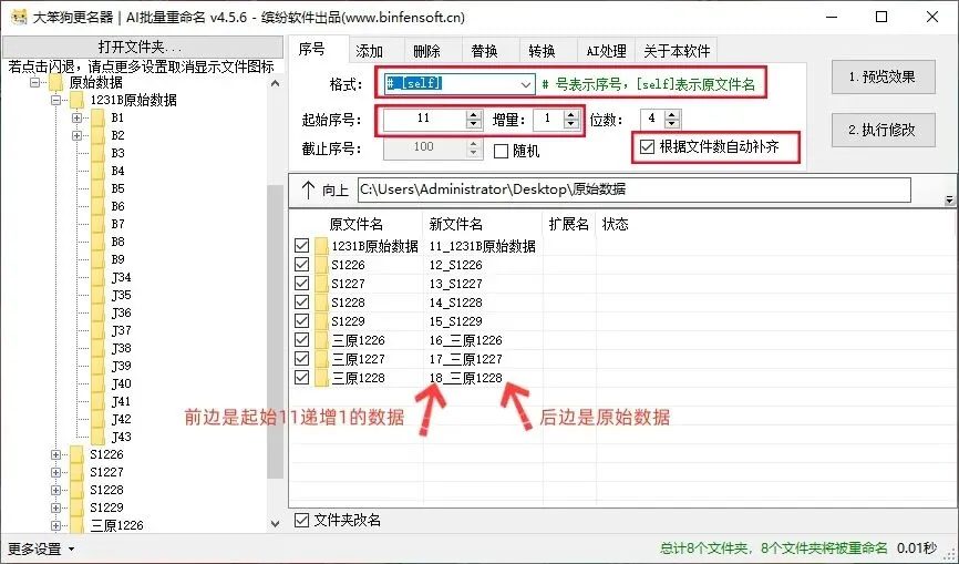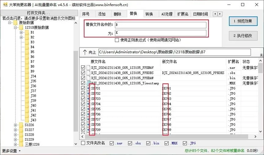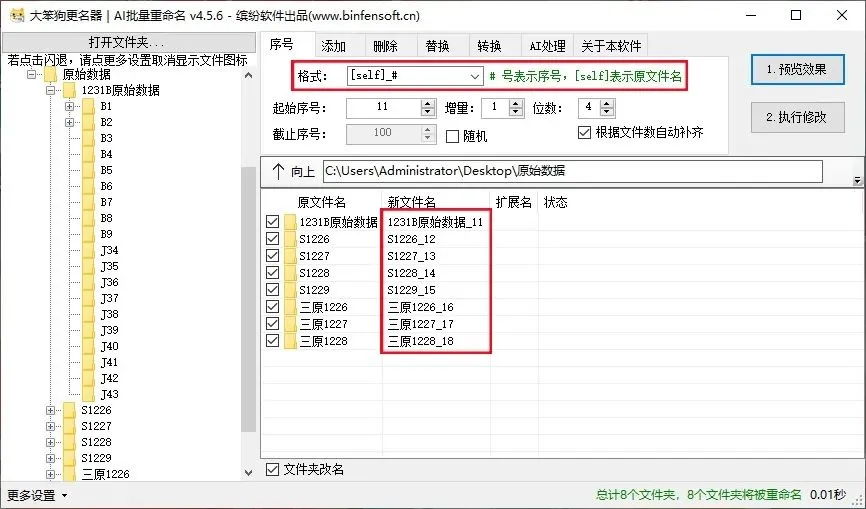 输入完想要的条件之后,点击“1预览效果”,可以查看有没有遗漏错误,确认无误后点击“2执行修改”即可完成重命名操作。