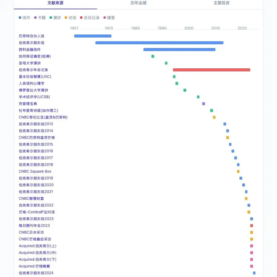 完整的资料清单在网站的"历史脉络"功能中可以看到——信件、书籍、演讲、访谈、会议记录、播客,六种类型用不同颜色标注,69年的资料分布一目了然: