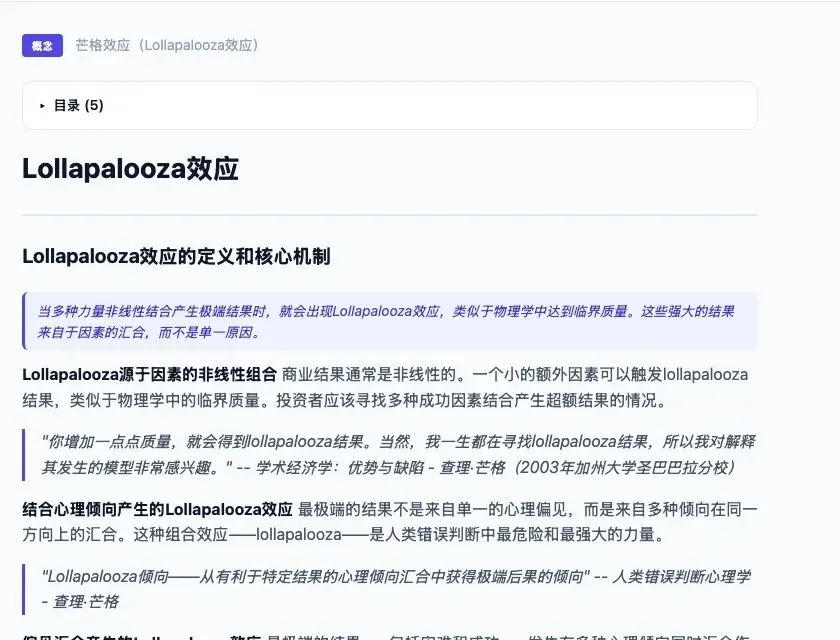 每个概念词条平均5,600英文词(约7,000中文字),引用10+份不同来源。比如"复利"这个概念,汇聚了十几份不同资料的论述:巴菲特10岁时的称重机实验、致股东信中$18变成$134,060的48年复利计算、芒格在Wesco年报中房地美7,200万投资增长到19亿的案例。