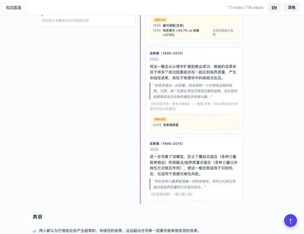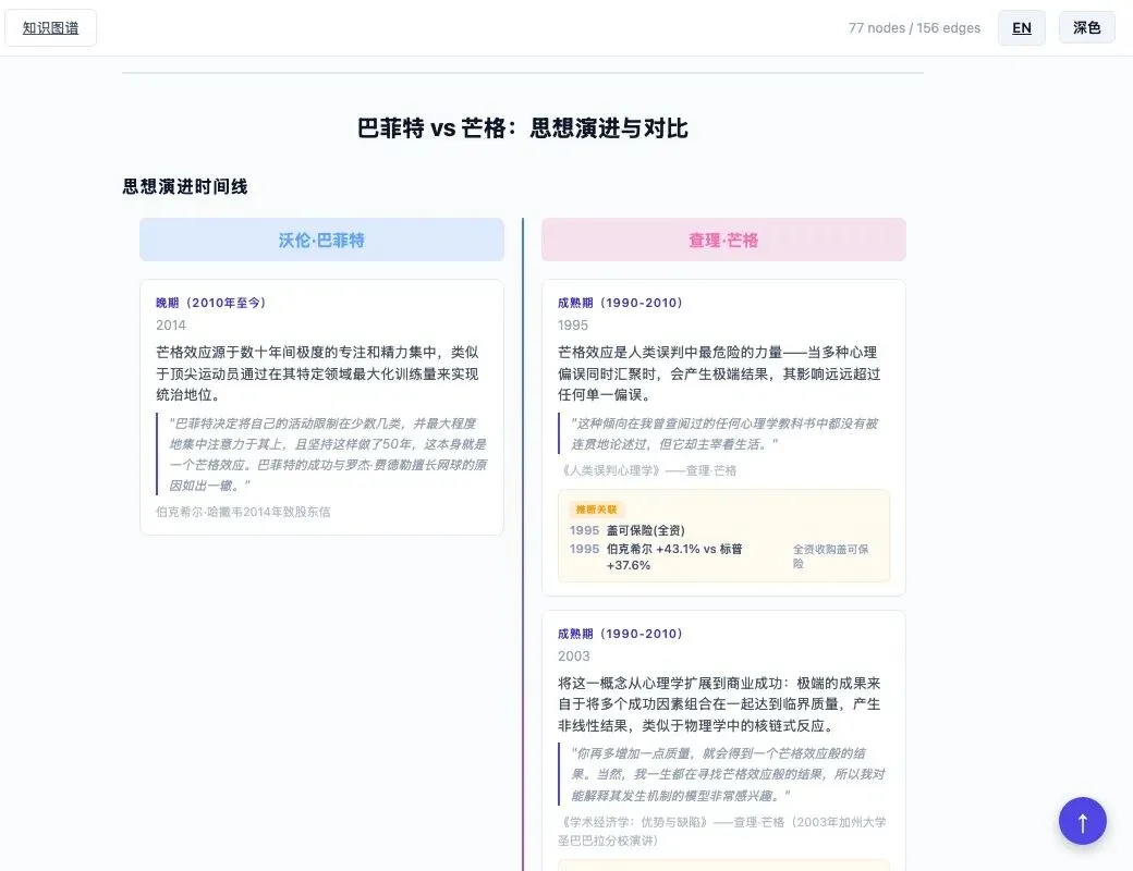 上图是网站中的思想演进时间线——左栏巴菲特,右栏芒格,每个阶段展示核心观点、原始引文和推断关联(相关投资案例)。芒格的三阶段演化清晰可见: