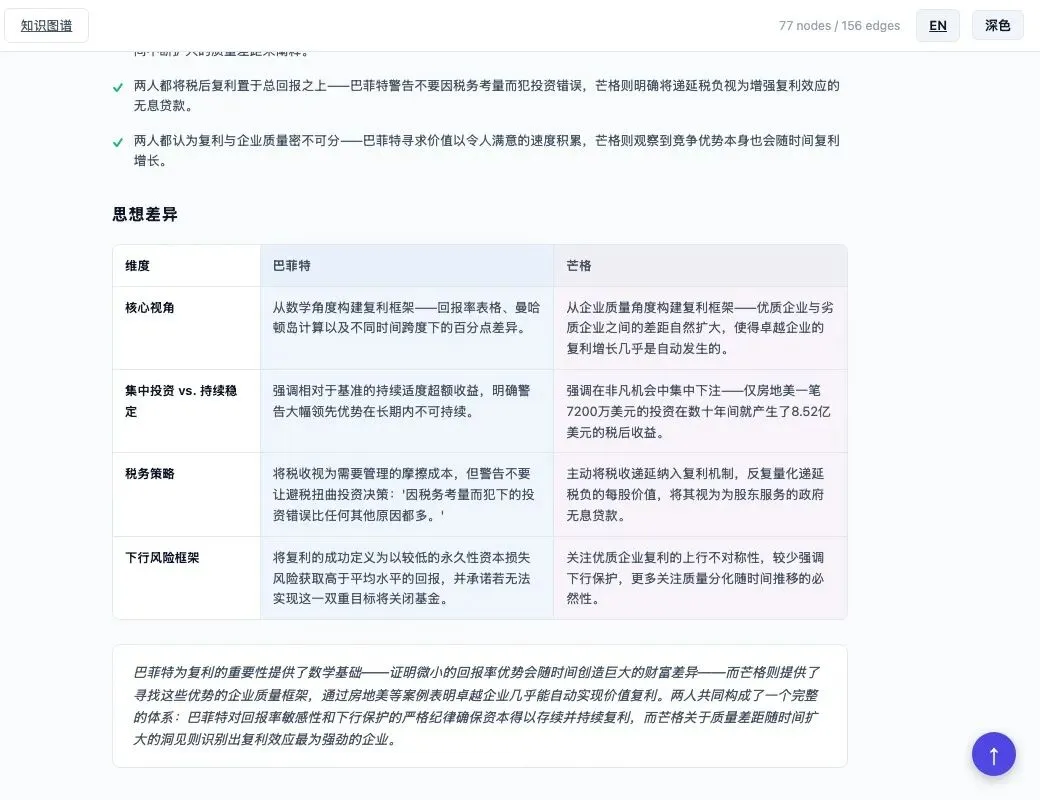 每个概念词条底部都有一个"巴菲特 vs 芒格"对比模块——共识是什么,分歧在哪里。