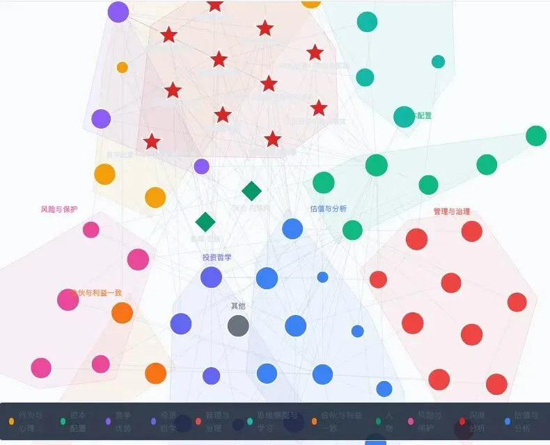 红色星形是12篇深度分析(投资哲学演进、护城河识别框架、认知偏误全景、伯克希尔组织模式等)。你可以直观地看到哪些概念是最大的枢纽节点。