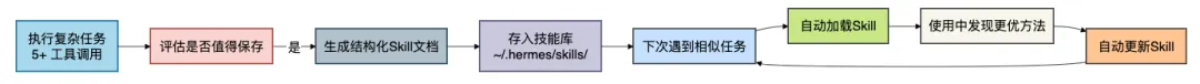 Hermes 不是靠你手动编写配置文件来扩展能力,而是自己在执行复杂任务后,自动提炼出可复用的解决方案。