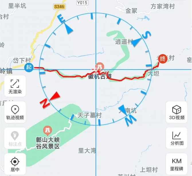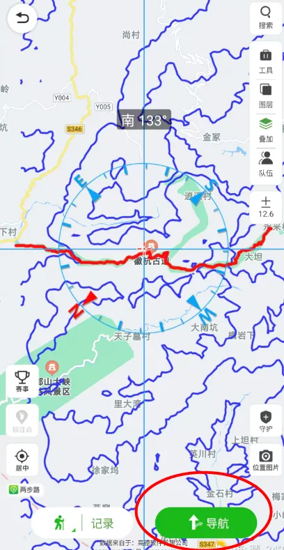 跟随导航:此时地图上会同时显示你下载的参考轨迹(通常是蓝色或紫色)和你实时行走的轨迹(通常是红色箭头)。你只需要确保自己的箭头沿着参考轨迹前进即可。