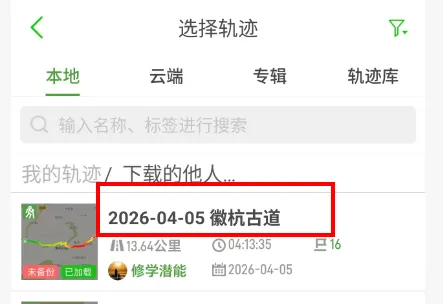 下载轨迹:点开选中的轨迹,将其保存到本地设备。这一步会同时保存路线的走向、详细数据(总里程、累计爬升、最高海拔)以及标注点等信息。