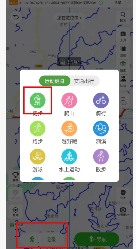 开始记录:APP底部会显示“记录”与“导航”两个按钮。点击【记录】,选择运动类型(如徒步),即可开始记录你的行程。