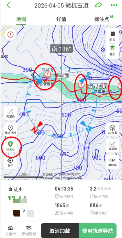 查看标注点:轨迹上带有“T”(文字)或图片图标的位置,是前人留下的重要标注(如岔路口、补给点、观景台),可以点击查看,对路线做到心中有数。