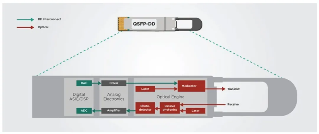 图 3:收发器由 DSP、模拟电子元件和光学引擎组成