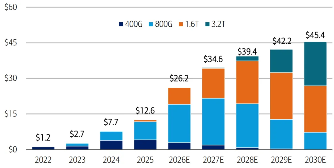 图 2:预期 AI 光学收发器市场将从 2025 年的 126 亿美元激增至 2030 年的 454 亿美元,主要由高速 (800G/1.6T/3.2T) 模组的需求推动