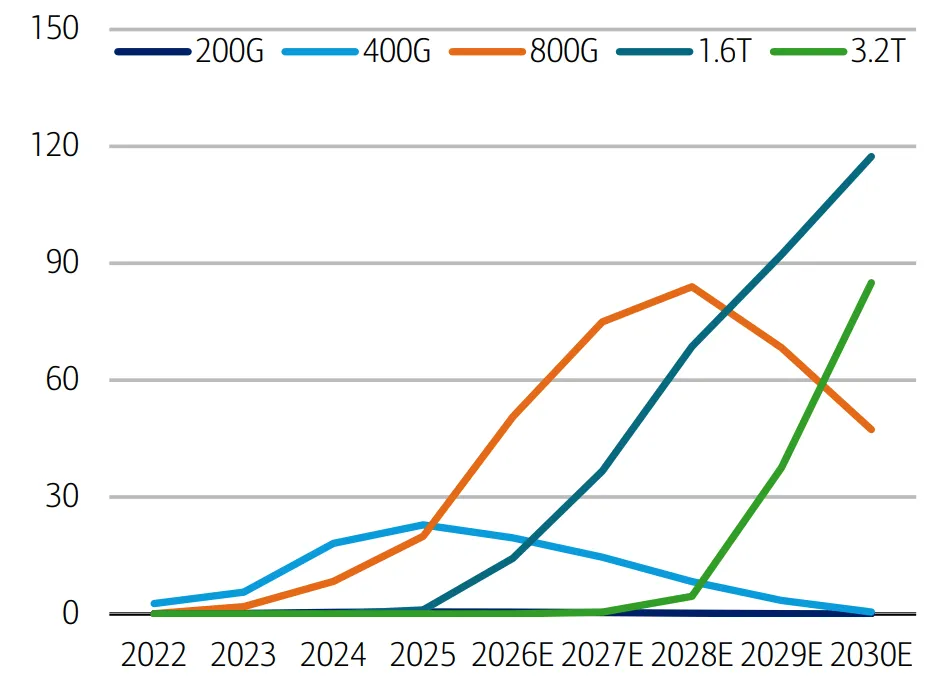 过去,光学收发器的采用曲线显示出强劲的初始出货量,随后随着竞争加剧,价格快速下滑。世代持续多年 ——10 Gbps 持续了七年,而 100 Gbps 持续了五年 —— 需求成长相对温和。AI 的兴起改变了这些动态。现代收发器世代现在以不到三年的周期发布,因为网络带宽需求每两年翻倍。